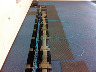 今回、導入されるPCの台数は20台。それに加えて先生用のPC、プリンター等周辺機器を併せて22本ものケーブルが床下を通って1ヶ所に集まってきます。それらを24ポートのHUBに接続し上位回線と結ぶのですが、これが結構複雑で大変です。業者さんはケーブルの両端にタグをつけながら1本ずつ丁寧に床を這わせていました。