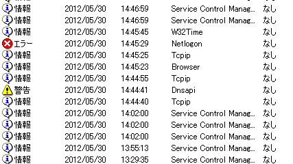 WindowsXPの場合はコントロールパネルの管理ツールの中にありますが、これを起動すると、普段は目にすることのない、PC内部での様々な動きが記録されていることがわかります。ここで注目するのは「システム」で、中を見てみると情報、警告、エラーの3種類に分けられたログがずらっと表示されています。この中で気をつけなければならないのが「エラー」で、PCに原因不明の不具合が起きているときは、大体このエラーが大量に、もしくは定期的に記録されていることが多いです。