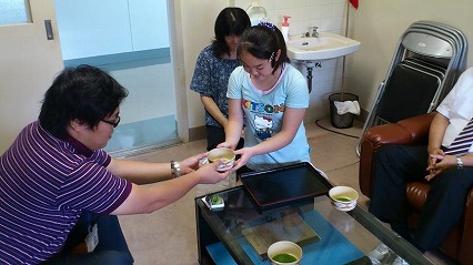 この小学校のクラブ活動では、色々なことを学んでいるらしく、今週はお茶(茶道)を学んでいるとのことでした。作法などを、後ろの先生に教わりながら、緊張した様子で、もてなしてくれました。いただく我々も、妙に緊張してしまいました。お茶にはなんと、本格的に和菓子まで付いておりまして、久々のお抹茶とあわせて大変美味しくいただいて参りました。結構なお手前でした。
