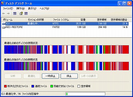 個人的には、気休め程度だと思っています。もしもこれで、早くなったとすれば、よっぽどひどく断片化されている場合だと思います。まあ、精神的はこれを、たま~にやれば、満足するかな。で、相談を受けた遅い?PCですが、これが、久々にみる真っ赤っかです。これなら、速くなるのかな?期待して数時間かけ、デフラグをしました。精神的には、かなり満足しました。でも、本当に早くなったのかな?やはり、よくわかりません?!