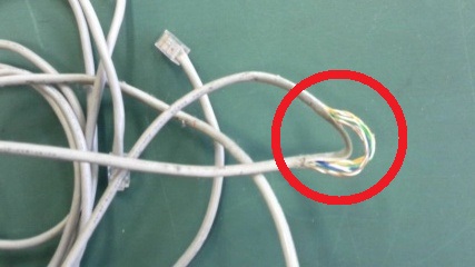 とある施設のケーブルの確認をしていたところ、机の下で「痛々しい」LANケーブルを発見しました。外側のビニール?が剥がれてしまい、カラフルな線が露出してしまっています。人間であれば、外科医に縫ってもらわないといけない状態です。