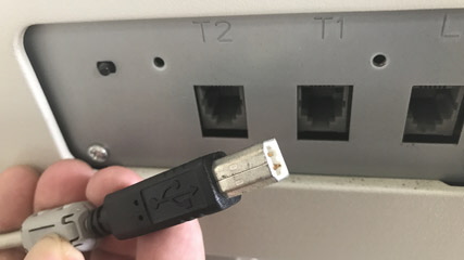 しかし、慌ててはいけません。まずはプリントサーバを再起動して様子を見るのが鉄則です。さらにプリントサーバの配線も含め再度設置状況を確認。ふと、プリンタ側に接続されているUSBケーブルのことが気になり、ちょっとだけ引っ張ってみます。すると、何の抵抗もなく「スポッ」と抜けました。何が起きたのかわからず、とりあえずプリンタの裏側に回ってコネクタを確認。