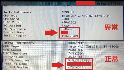 次に起動するときとしないときで何が違うのかを調べると、起動できないときはBIOSがおかしいということに気がつきました。具体的にはBIOSのファームウェアバージョンが「Unknown」、シリアルナンバーが「123456789」となってしまい、BIOSの段階で起動に失敗しているのが濃厚となります。