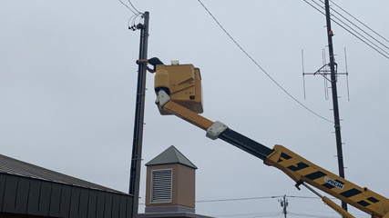 「災害はいつやってくるかわからない」を合言葉に、さっそく工事に取りかかりました。実はこの案件は少し工夫しなければならない難工事。というのも、学校の建物内にLANケーブルを引くのであれば簡単なのですが、今回は少し離れた建物までLANケーブルをもっていかなければならないのです。屋外にLANケーブルを配線する場合は「架空」か「地下埋設」のどちらかの方法となるのですが、いずれも我々には無理な工事。今回は業者さんの力をお借りして「架空」することになりました。