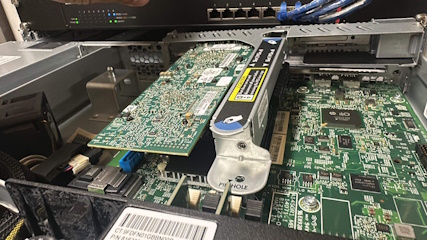 こうなるともう禁断のアレしかありません。もう役割が終了して電源を落としてあった旧情報系サーバ。これの中に全く同じ型のNICが入っています。そうです、部品取りの決行です。普通のPCであれば、部品取り用のジャンクからパーツを取ってきて付け替えるなど日常の出来事ですが、それがサーバとなると若干の緊張と躊躇いが。でも、やるしかありません。NICが壊れたくらいで、我々はへこたれません。