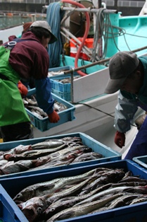 通常操業は、午前5時頃に漁場を目指し出港。凍てつく寒さの中、漁を終えた漁船は午前11時頃に帰港します。荷揚げされた漁箱をのぞくとキラキラと光ったスケトウダラが・・・目で見てもまさに新鮮!と分かるほどです。
