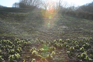 ひらたないスキー場は雪もすっかり融けて、フキノトウの群生が朝陽に照らされていました。