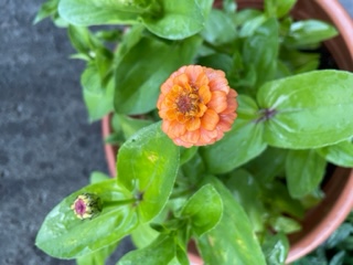 百日草の花の色は咲いてからのお楽しみです。1つ目はオレンジ色でした!
