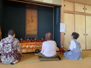 地域の方々で 木魚や鐘を鳴らしながら お経のようなものを唱えました。 私も参加して 手を合わせて 一緒に行いました。