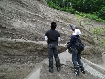 地層をよく見ると、平行な層と傾斜する層が数10cmごとに繰り返しています。これをクロスラミナと呼び、堆積の仕方がその時代の水流の方向を表しています。この上八雲一帯は120万年前は浅い海で、あちこちから粗い砂やレキとともに貝などの化石が流されてきてました。