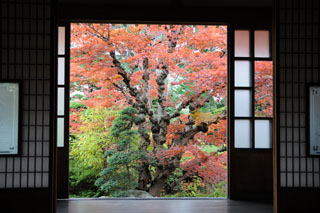 池に映る真っ赤なもみじ、枯山水を彩る赤、梅村庭園のもみじは今が見ごろです。外ばかりではありません。梅雲亭の離れから見るもみじも一枚の絵のようで、見ごろです。庭園は、この赤が終われば、白に彩られた庭に衣更えします。
