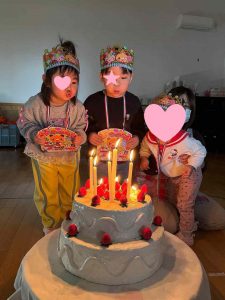 お誕生日の3人は、上手にロウソクの火を協力して消すことができました!