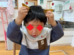 「おにだじょーーーー👹」と、鬼のつのを自分の頭に乗せてる陽気な1歳児のRくん。豆まき会ではどうなることでしょうか?!