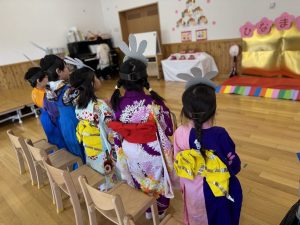 くまいし保育園のひなまつり会は、毎年恒例になっている着物や袴に着替えて行っています。
