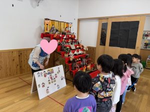 初めに「パネルシアター」でひなまつりの由来を聞き、「後でクイズだすよー」と伝えます。