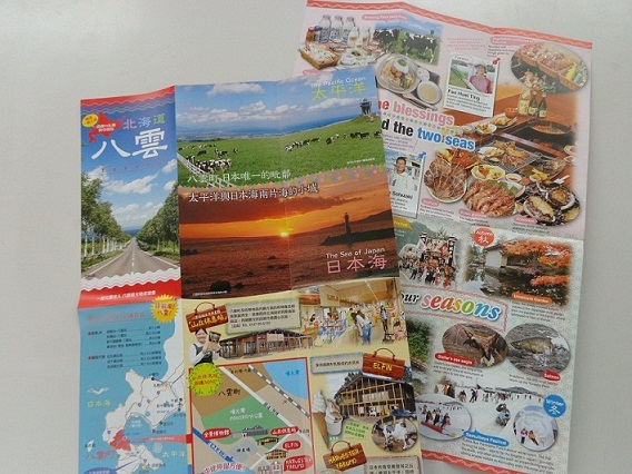 八雲町ではこれまで、観光パンフレットを作成してきましたが、このたび、外国語版リーフレットが完成しました!八雲町の伝えたい魅力をぎゅぎゅっとA3両面に凝縮しております。「八雲町情報交流物産館 丘の駅」では既に配布が始まっており、今後は函館空港・新函館北斗駅等で順次配布予定です。