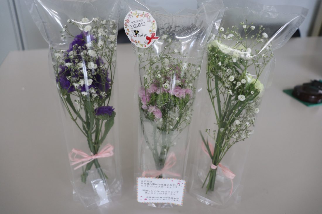 八雲町産のカスミソウとスターチスを使用したアレンジフラワーとなっており、水がなくても長持ちするエアフルールを使用しています。