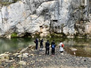 猊鼻渓ははじめ小雨交じりの天候で、船に雨をしのぐための透明な幌を張っての舟下り出発となりました。船頭さんの歌を聴きながら昼食を味わい、折り返し地点にある名物の「運玉」の場所では、降っていた雨も上がり、ほとんど雨にも当たらず1時間20分ほどの舟下りを満喫したようです。