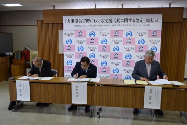 令和7年1月22日(水)、全国の運送事業者を中心とした経営支援を展開する「一般社団法人AZ-COM丸和・支援ネットワーク」と道内で運送事業を主に展開する「株式会社北海道丸和ロジスティクス」、八雲町の三者による災害時の支援活動に関する連携協定を締結しました。 八雲町に大規模な災害が発生した際に支援物資の輸送や物資等の調達や供給体制を構築するなど、互いに連携し、円滑な支援活動を展開します。