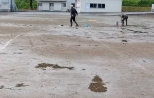 早朝には、まだ水たまりがいっぱいだったグラウンド。
