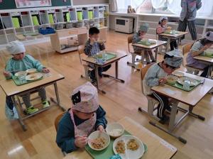 みんなパクパクモリモリ、おいしそうに初めての給食をほおばっていました。