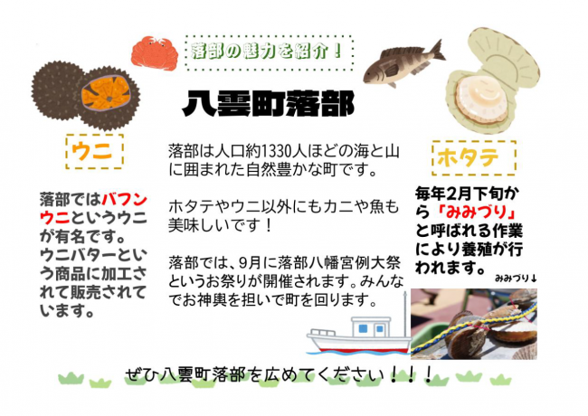 今年度から本校では、総合的な学習の時間にふるさと学習を実施しています。落部地区の産業について学び、9月3日(日)から行われる見学旅行で、PR活動を東京浅草で行ってきます。今年度は、漁業を中心としたPR活動ですが、今後は小・中で連携し、色々な産業について取り組んでいく予定です。