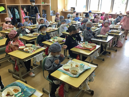 配膳する子は事前にしっかり30秒の手洗いとマスク。