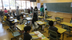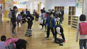 玄関ホールで 靴を履いたり 提出物を整えたり