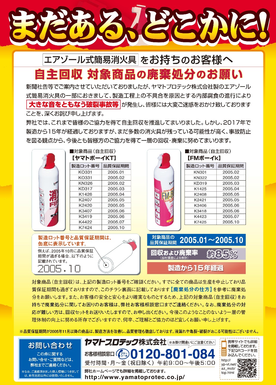 エアゾール式簡易消火器の不具合(腐食等)により、破裂するなどの事故が多発しておりす。近年は、製造業者の広報や回収により、事故が減少しておりますが、再度対象製品を保有していないか確認し、保有している場合には、下記のリーフレットに従い、対応してください。