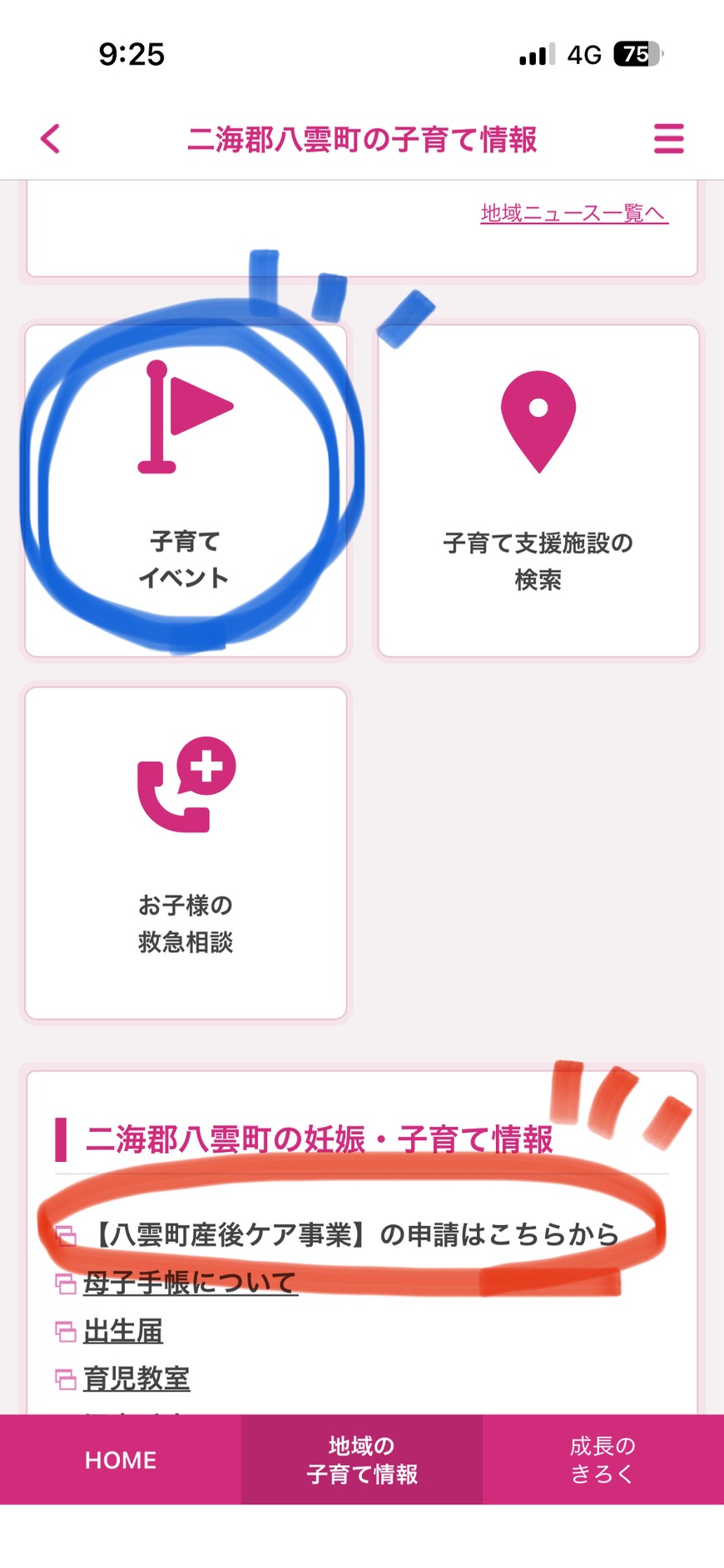 「子育てアプリやくもっ子by母子モ」の地域の子育て情報タブをクリック