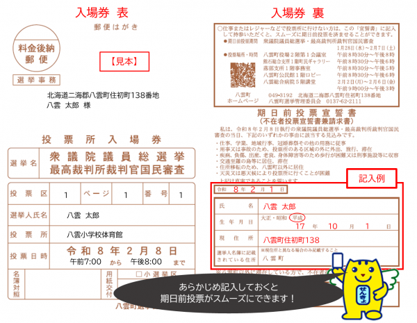 八雲地域と熊石地域を合わせて26投票所を設置します。一部の投票所では閉鎖時間を繰り上げています。入場券をよくご確認ください。
