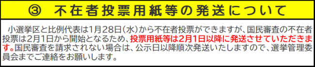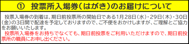 投票所入場券は、1月28日(水)・1月29日(木)・1月30日(金)の3日間での配達を予定しています。