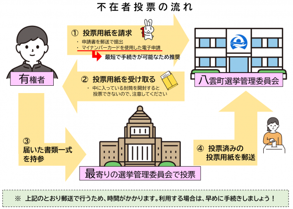 出張などで八雲町外へ滞在しているため投票日当日に投票所に行けない方で、期日前投票をすることも困難な場合は、マイナンバーカードを活用したオンライン請求または請求書兼宣誓書をダウンロードし八雲町選挙管理委員会へ請求するなどの方法により、「不在者投票宣誓書兼請求書」に、滞在している住所(投票用紙の送付先)、八雲町の住所、氏名、生年月日を記入し、八雲町選挙管理委員会へ送付してください。